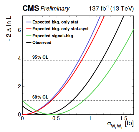 当考虑同电荷W玻色子质心系时,利用CMS实验在2016-2018收集的137/fb的13TeV对撞数据,给出单纵向W玻色子极化散射的观测(预期)敏感度为2.3(3.1)倍标准偏差。同时,也对双纵向散射分量截面给予了限制。如图所示,测量结果为0.32+0.42-0.40fb,理论预言结果为0.44+-0.05fb。