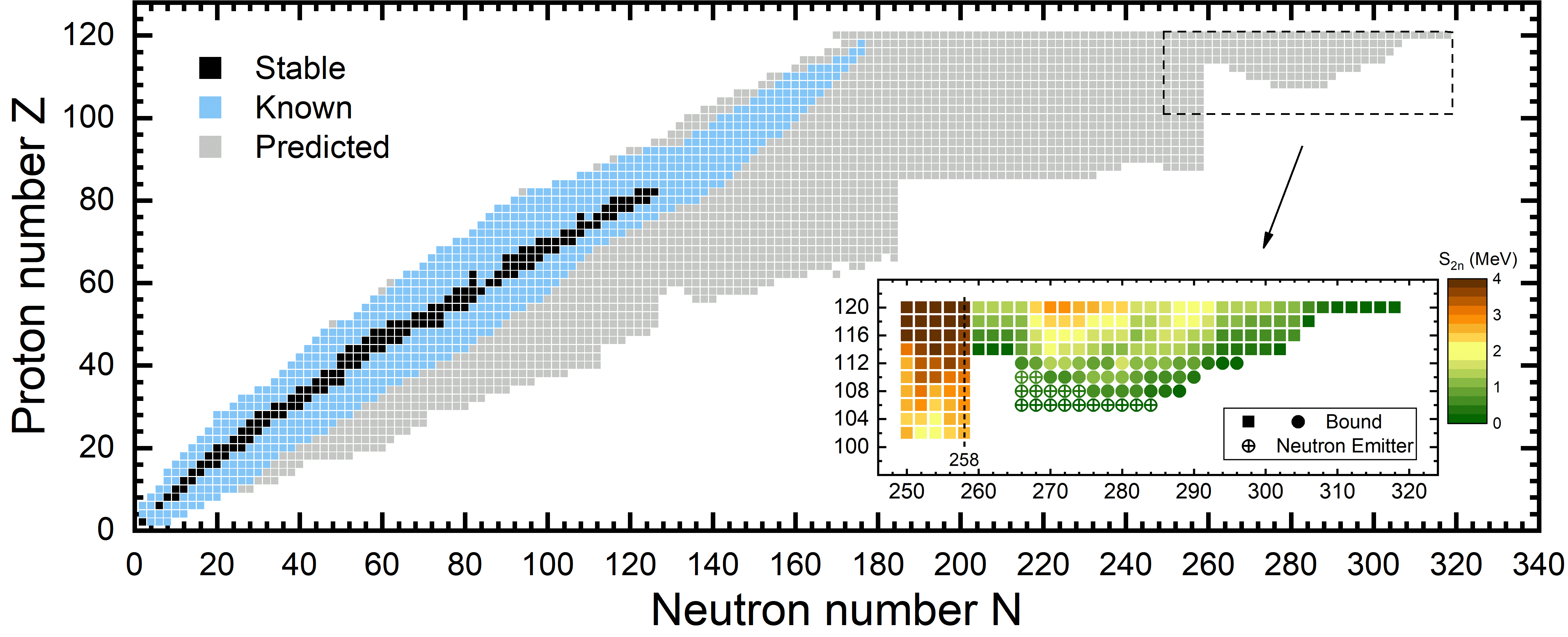 DRHBc理论给出的原子核版图(其中黑色方格表示稳定原子核,蓝色方格表示已观测到的原子核,灰色方格表示预言的束缚原子核)及超重核区近中子滴线原子核的双中子分离能(内插图,其中实心圆表示滴线外的束缚核,它们组成丰中子半岛,十字圆表示多中子发射核)