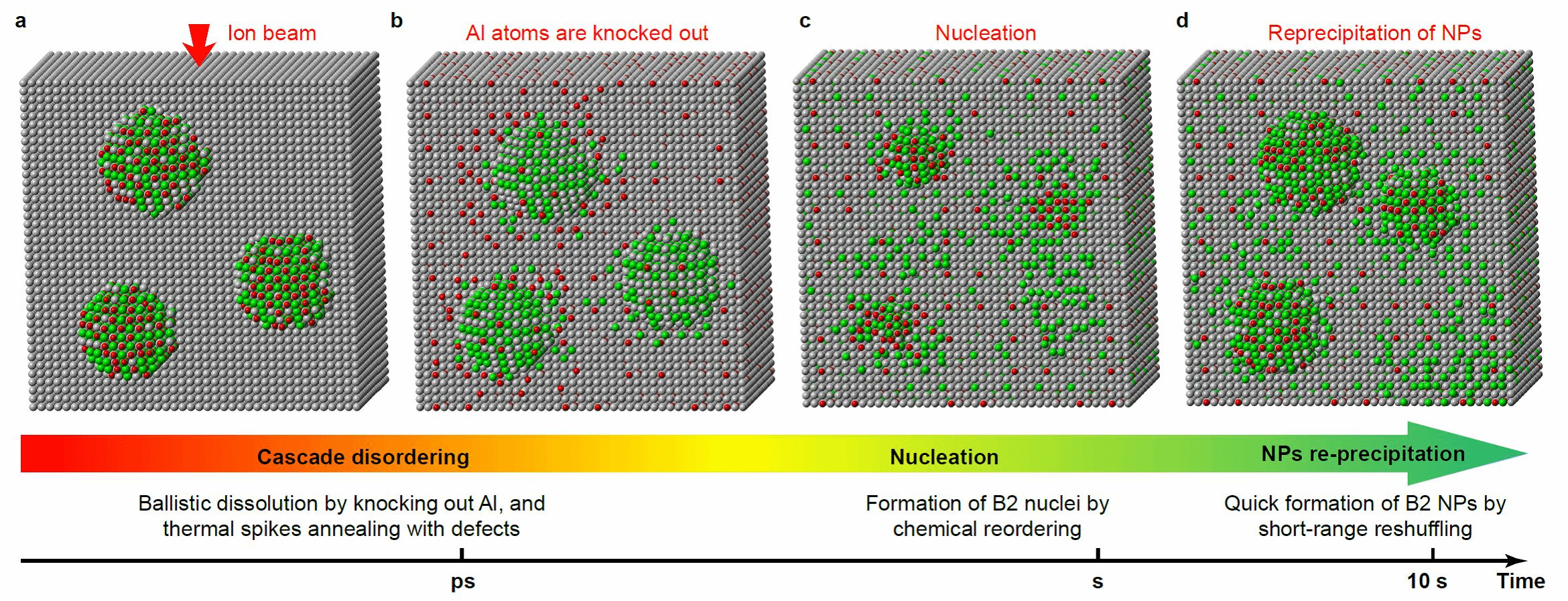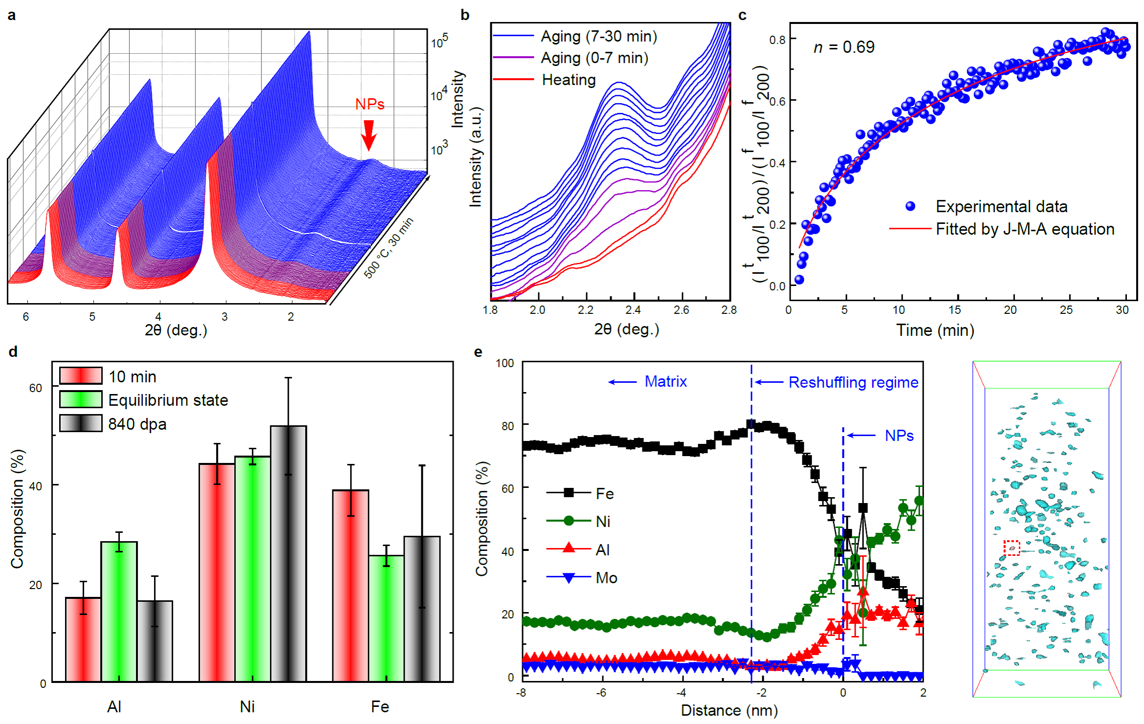 (要点:1. 把辐照和温度的协同作用区分开,单独研究温度作用下有序纳米粒子的析出行为。原位同步辐射XRD结果表明辐照引起了析出相的快速析出,实验上可以看到在12秒后即可观测到有序纳米粒子信号;2. 对比辐照前样品、高温辐照样品和不含析出相样品经过10分钟同样温度时效后的纳米粒子成分,可以看出后两者Al含量类似,且均低于辐照前样品中有序纳米粒子的Al含量,佐证了辐照条件下的析出相持续的发生动态有序-无序转变。)