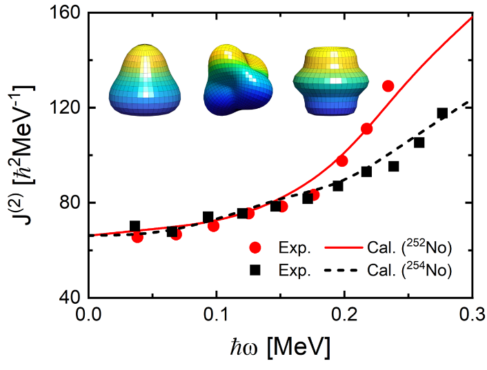 质子数超过100的原子核,即超镄核,是目前实验测得转动谱的最重的原子核,其转动性质对于确定超重核的单粒子能级结构、预言“超重稳定岛”的位置至关重要。因此,世界上许多知名核物理研究机构,如美国阿贡国家实验室、德国赫姆霍兹重离子研究中心等合作组,都致力于精确测量超镄核的转动谱。本世纪初,相关实验发现,随着角动量的增加,相邻超镄核252No 和254No 的转动惯量展现出截然不同的上弯现象,这一现象一直没有得到合理的微观理论解释,由此成为了困扰核物理界 20 多年的疑难问题。