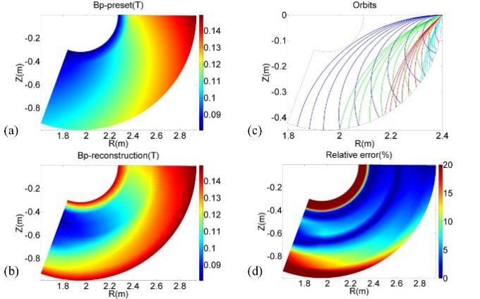 图1: 激光离子束轨道探针(LITP)系统示意图(左),以及LITP反演托卡马克极向磁场的理论结果。左图中(a)为预设的托卡马克二维极向磁场(Bp)剖面、(b)为LITP二维反演结果;(c)为激光离子束轨道;(d)为二维Bp反演重构的相对误差。 |