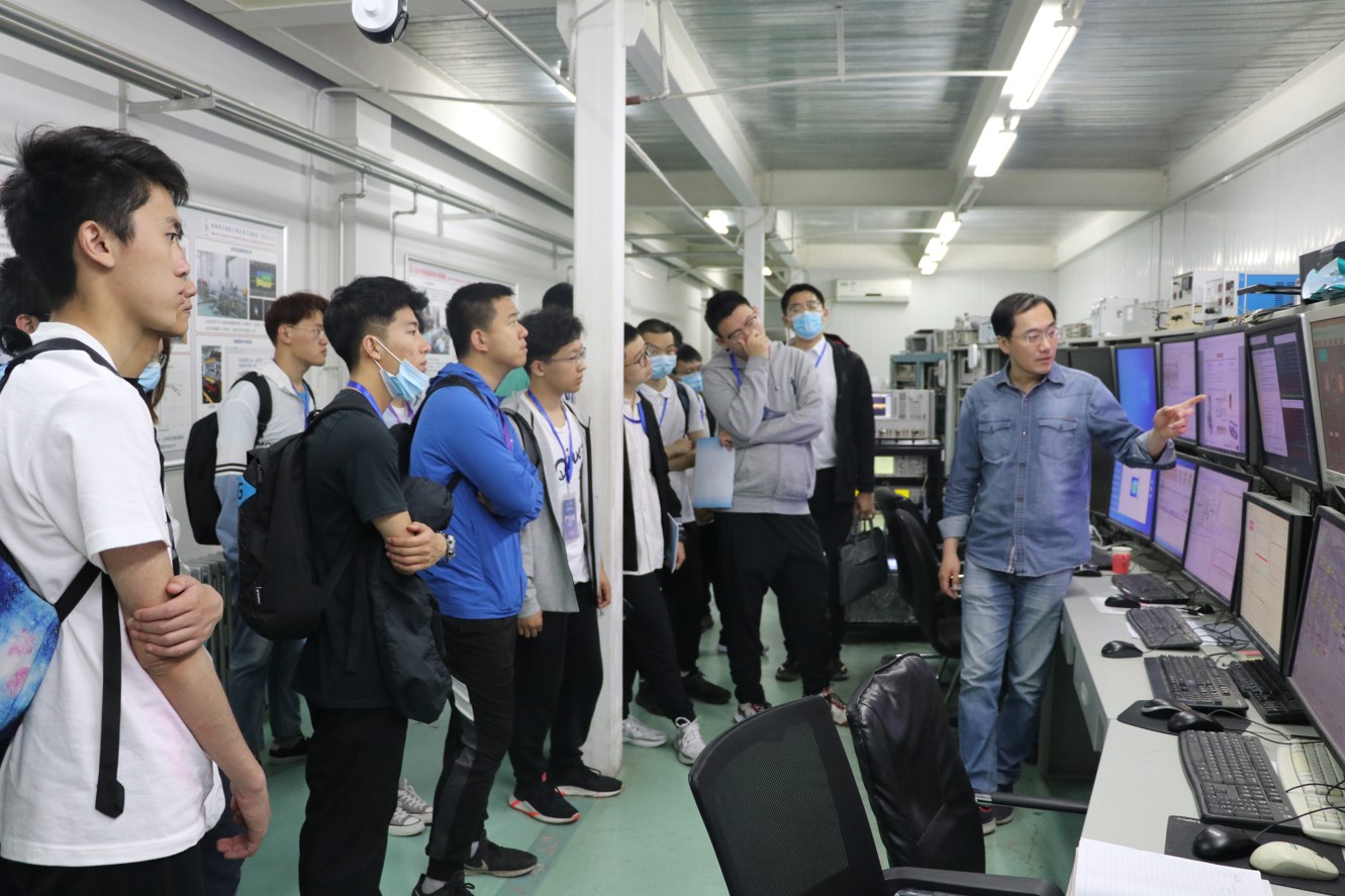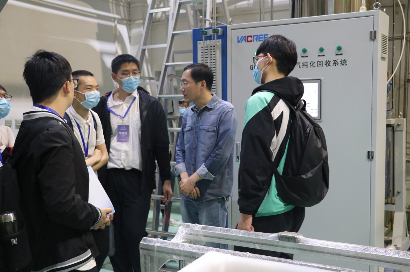 随后,师生前往技物楼去,由林林带领大家参观了射频超导加速器实验室,对该实验室的发展历程、主要研究内容、实验装置及应用等做了大致介绍,并一一回答了学生们对加速器的运行原理、运行环境的要求、运行实验数据、电子加速等方面提出的问题。该实验室建设于1988年,经过三十多年的发展,该实验团队在关键技术上实现了突破,成为国际上少数几家掌握超导加速技术的研究组,大大推动了国内超导加速技术的发展和超导腔的国产化进程。