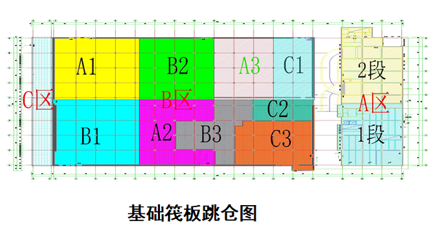 本工程B区基础结构属于超长、超宽、超厚的大体积混凝土构件,东西长96.2米,南北宽82.7米,筏板厚度为2米,最厚处达到3米,面积为7897平方米,混凝土总方量为12077立方米。根据不同基础形式,将超厚筏板分为9个仓,跳仓进行浇筑,本次浇筑的A1仓为混凝土方量最大的分仓,约2708立方米。