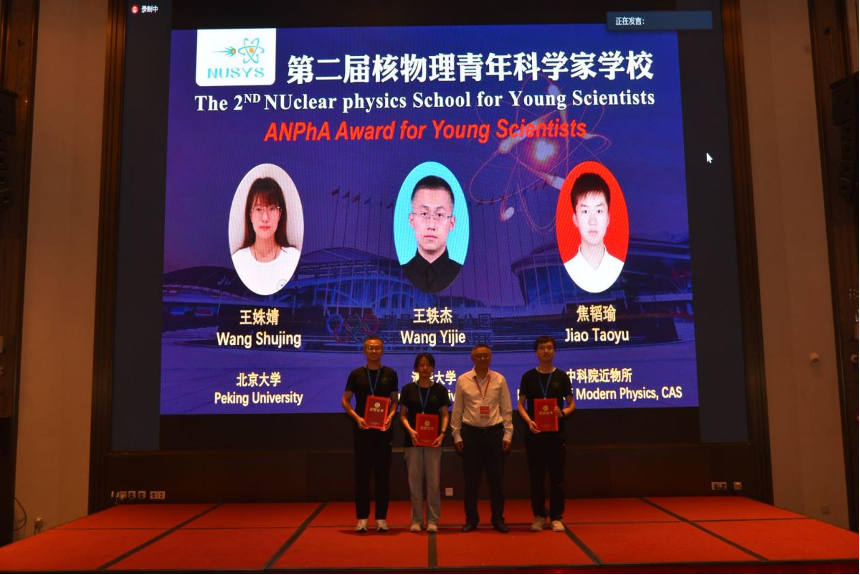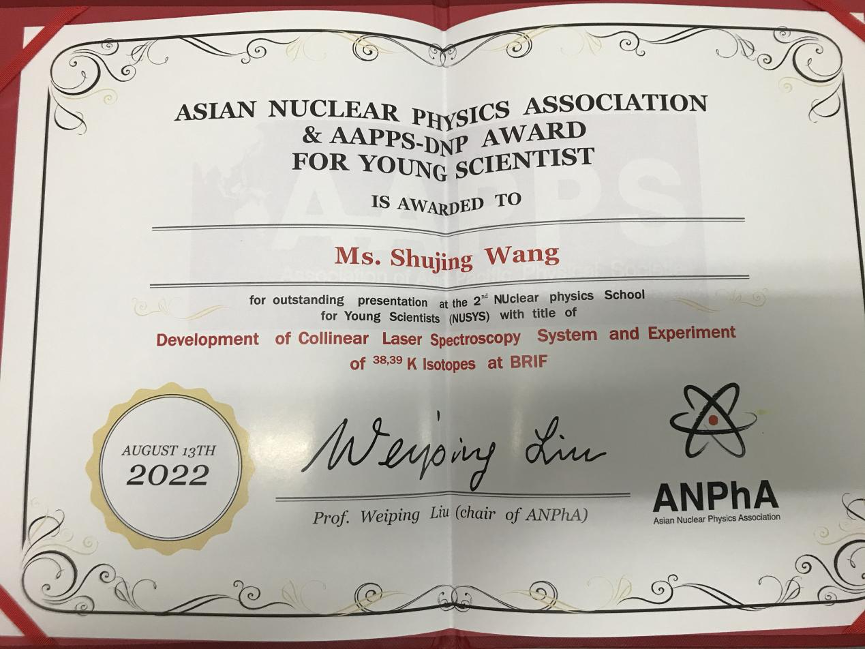 2022年8月13日,在第二届核物理青年科学家学校(NUclear physics School for Young Scientists, NUSYS)的闭幕式上,北京大学物理学院技术物理系、核物理与核技术国家重点实验室激光核谱与核性质课题组博士生王姝婧(导师为杨晓菲研究员)因在NUSYS上的优秀报告——“Development of collinear laser spectroscopy system and experiment of 38,39K isotopes at BRIF”,获得亚洲核物理联合会(Asian Nuclear Physics Association,ANPhA)青年科学家优秀报告奖,同时获此奖项的还有清华大学的王轶杰博士和中科院近物所的焦韬瑜博士。