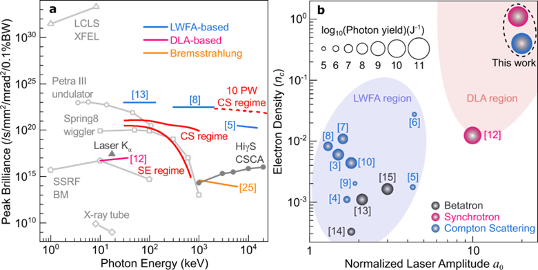 图a:此工作(红色曲线)获得的光子亮度与现有的X射线光源的对比。其中Spring8是位于日本兵库县播磨科学城的目前电子能量最高的同步辐射光源;图b:此工作所处于的参数区间及单位激光能量的光子产额对比