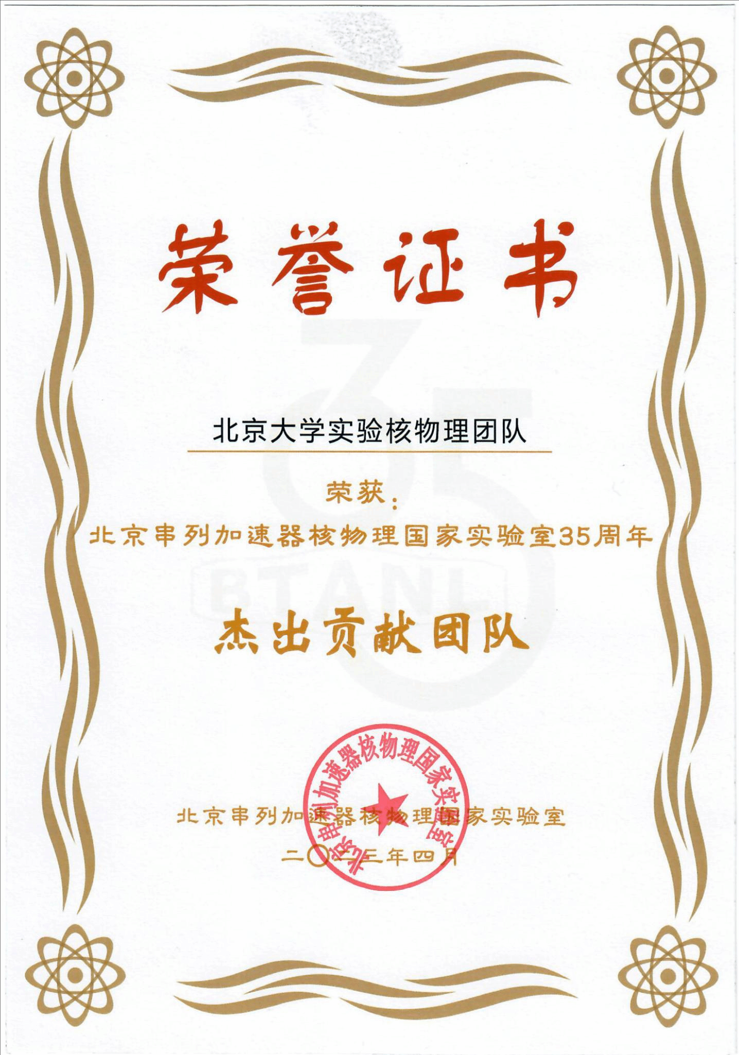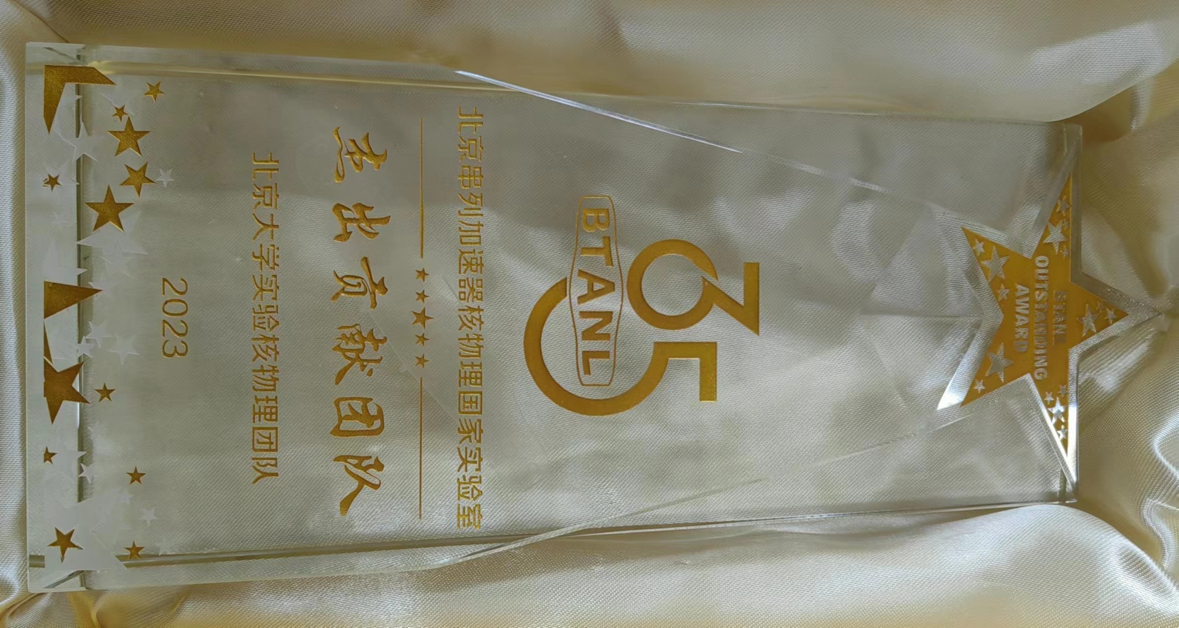 2023年4月16日,中国原子能科学研究院召开了北京串列加速器核物理国家实验室35周年暨张焕乔院士学术思想研讨会。会上宣布了串列实验室35年杰出贡献奖,包括个人奖1项,团队奖7项(基础研究方面3项,应用研究方面3项,加速器装置运行1项)。北京大学实验核物理团队荣获杰出贡献团队,杨晓菲研究员代表团队领奖并作了获奖报告。