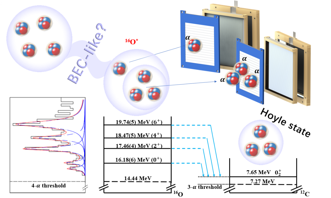 集团结构是在原子核低密度区普遍出现的奇特状态,近年来受到理论和实验的广泛关注。按照𝛼共轭核的Ikeda图(见图1),𝛼集团结构容易出现在对应的集团分离阈值附近。随着激发能的提高,可以出现多𝛼结构直至最高阶的全𝛼结构。如果所有𝛼粒子均处于S轨道且体系的整体空间分布扩展,则原本以费米子(核子)独立运动为基础的核体系可转化为以玻色子运动为基础的BEC状态。这种演化体现了量子多体结构的奥妙,对核物质形态和核天体过程有重要影响。此前的实验和理论研究基本确认, 天体演化过程中影响巨大的12C的Hoyle态(7.65 MeV的激发态)是由3-α组成的类BEC状态,它主要通过α+8Be→3α衰变。比12C重的体系里,由于实验直接测量多个α且判断它们所处状态确实很困难,这种状态是否存在迄今缺乏可靠的实验证据。