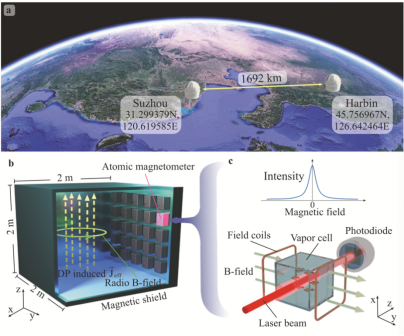 图一:a:放置于苏州和哈尔滨的量子探测器阵列;b:每个站点由一个边长两米的屏蔽屋和放置于屏蔽屋墙上的多个磁力仪组成,磁力仪用于捕捉沿轴线方向暗光子暗物质激发的磁场信号。c:原子磁力仪对磁场的测量原理。