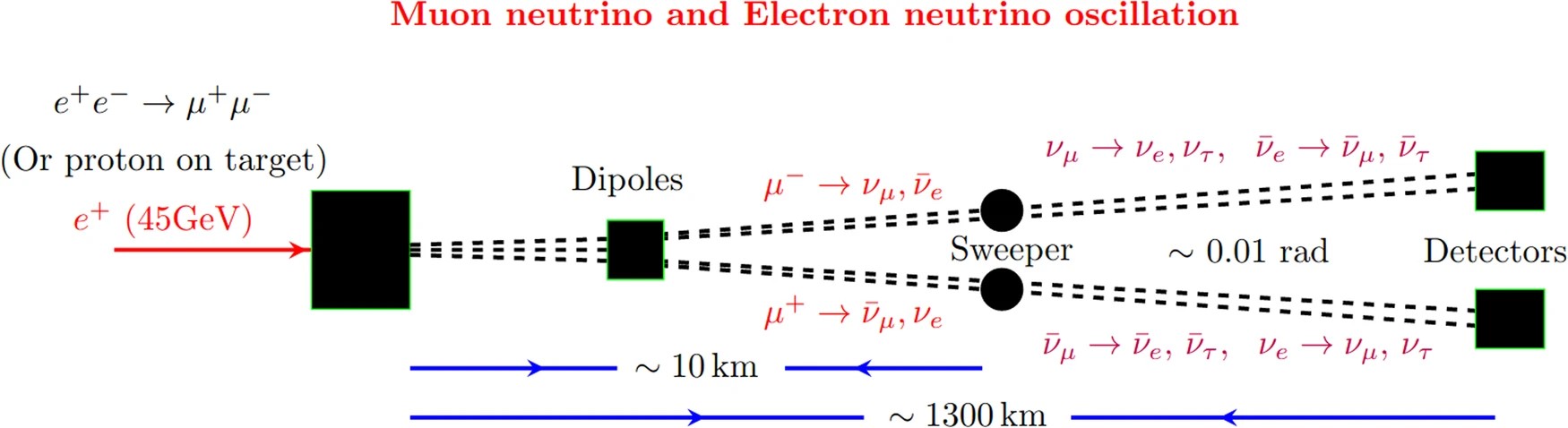 近日,北京大学物理学院技术物理系李强教授课题组及其合作者提出使用高能缪子束流及其衰变产物来测量中微子性质的新方案。该方案提出采用能量为45GeV的正电子束流来打靶来产生高能量的共线缪子束流,这些缪子束流传播、衰变产生中微子束团,后者飞行1000余公里后到达远方探测器,通过分别探测缪子、电子、陶中微子和其反中微子的出现率可以探测中微子的电荷宇称守恒破坏因子。课题组通过模拟长基线中微子振荡实验,对于电荷宇称守恒破坏因子进行研究,并且预研了应用在类似美国深部地下中微子实验DUNE之类的实验中,可有望得到五个标准偏差以上的可信度的结果。