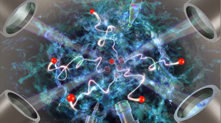 图1 实验室产生电子随机加速过程的艺术图。图中红色小球代表被加速的高能电子,白色曲线代表随机加速电子的运动轨迹,背景紊乱的结构代表天体中大尺度湍流等离子体