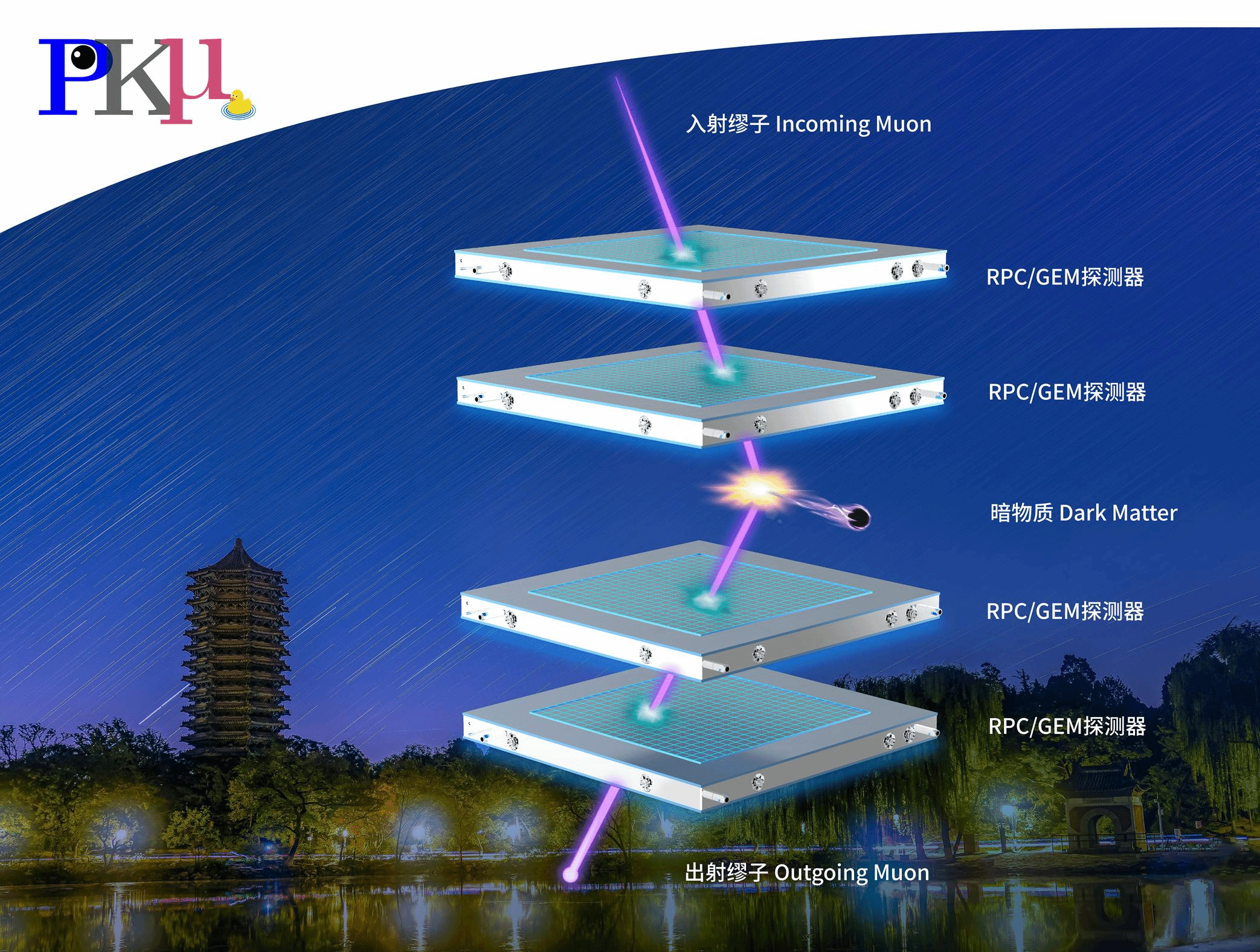 图1: 北京大学研究团队提出的利用缪子散射成像装置探寻暗物质示意图