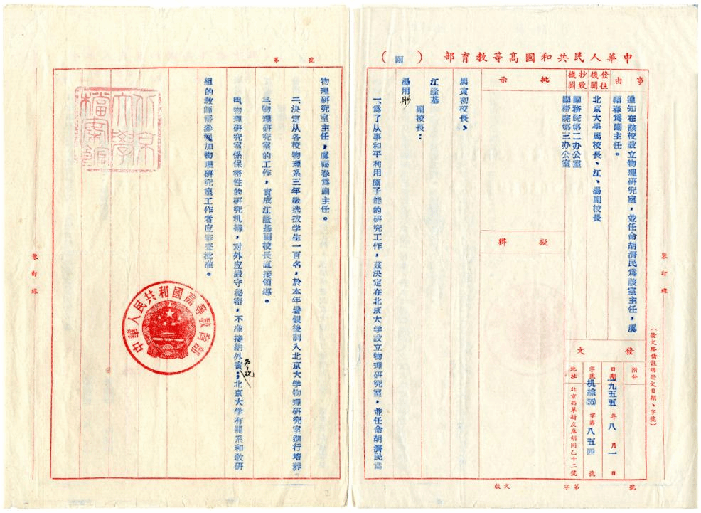 1955年8月1日,高等教育部发文正式在北京大学设立物理研究室