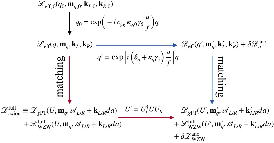 在有效场论框架下,构造轴子-介子相互作用的低能拉氏量并不困难。然而,从高能尺度的轴子-夸克-胶子相互作用,自洽地匹配到低能轴子-介子相互作用却并不容易。首先,夸克手征基选择会导致拉氏量中轴子-介子相互作用项的具体形式发生变化。然而,在一个真正自洽的理论中,最终的物理可观测量必须独立于手征基的选取。其次,在QCD和低能强子物理中,Wess-Zumino-Witten(WZW)相互作用至关重要。它描述了由手征反常引起的多介子和光子的相互作用。因此,一个完整的轴子-介子低能理论应该包含 WZW 相互作用。最后,轴子的PQ全局对称性、复合矢量介子的全局对称性以及标准模型的基本规范对称性之间存在混合量子反常,可能会破坏标准模型的规范不变性,需要得到妥善处理。