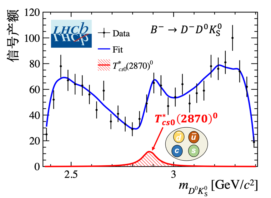 欧洲核子研究中心大型强子对撞机底夸克实验(LHCb)北京大学研究团队首次在B-→D-D0KS0衰变的D0KS0末态发现显粲四夸克态Tcs0*(2870)0实验信号,为深入理解奇特强子结构提供了关键实验依据。相关研究以“B-→D-D0KS0衰变发现显粲四夸克态Tcs0*(2870)0”(Observation of the Open-Charm Tetraquark Candidate in the B-→D-D0KS0Decay)为题,2025年3月11日在线发表于《物理评论快报》(Physical Review Letters),并被选为编辑推荐(Editors’ Suggestion)。