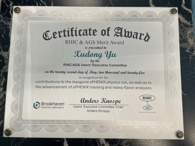 北京大学物理学院技术物理系2021级博士研究生余旭东由于对sPHENIX首次物理运行的贡献,以及在sPHENIX径迹重建和重味夸克分析研究中取得的突破性进展被授予该奖项(for his contributions to the inaugural sPHENIX physics run, as well as to the advancement of sPHENIX tracking and heavy flavor analyses),是本次三名获奖研究生之一。sPHENIX(super Pioneering High Energy Nuclear Interaction eXperiment)是过去20年内RHIC上第一个新的对撞机探测器,是对PHENIX实验的升级,拥有全新的探测器和电子学读出系统。sPHENIX的物理目标是通过测量喷注及其子结构和重味粒子来研究夸克胶子等离子体的性质。北京大学在冒亚军教授的带领下于2018加入sPHENIX合作组,在电磁量能器设计建造、实验运行、探测器维护和刻度、径迹重建以及重味物理分析等方面发挥了重要作用。