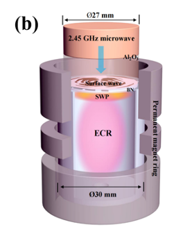 针对这一世界性难题,彭士香课题组自 2013 年起致力于微波驱动氢分子离子源研究。团队早期在脉冲模式下取得突破,2017 届博士生徐源通过优化微波耦合结构,实现大于 40 mA 脉冲 H₂⁺束流,其成果目前仍处于国际领先水平。随后,课题组2021 届博士研究生武文斌创新提出"三相图理论",首次阐明 H⁺/H₂⁺/H₃⁺离子组分随运行参数的变化规律,为精准调控离子比例奠定理论基础。在此基础上,团队进一步引入“表面波起振-电子回旋共振加热”的协同机制,揭示了微型腔体中等离子体”从 0 到1”的起振机理,2023 届博士生马腾昊对这一机理进行了深化完善。基于上述理论突破,课题组成功研发出全永磁2.45 GHz微波驱动离子源(MMDIS)。该离子源采用混合放电机制:表面波主导等离子体点火,起弧后电子回旋共振(ECR)维持高密度等离子体,表面波在此阶段承担辅助作用;配合低气压环境,可有效抑制 H₂⁺离子碰撞解离。实验中,150 W 微波功率下,MMDIS离子源成功产生 22 mA 直流 H₂⁺束流,H₂⁺离子占比70%,混合束发射度 0.12 π·mm·mrad,各束流参数均显著优于国际同类型装置,处于全世界最优水平。