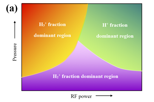 图2:(a)三相图: 不同工作参数下的离子分数优势区间;(b)混合加热放电(HDH)机理。