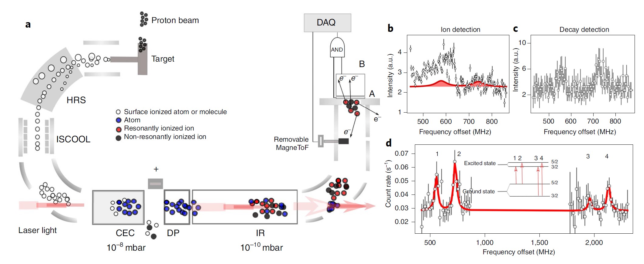 图1: (a)共线共振电离谱及β粒子探测系统;(b)利用离子和(c)β探测技术获得的部分超精细结构谱图;(d)52K的超精细结构谱图。