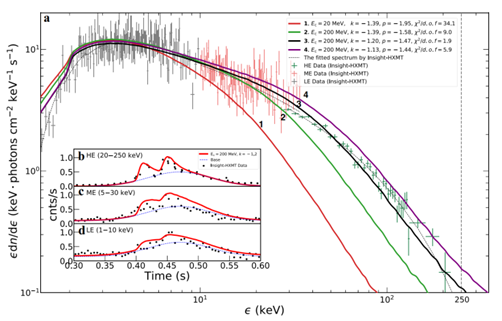针对两个阶段的集成跨尺度数值模拟中,合作团队首先通过动理学粒子模拟QED磁重联过程,揭示了QED效应对磁重联加速产生的粒子能谱幂率谱谱指数和截止能量的显著影响;并通过调控磁重联磁化参量(定义为磁能密度和物质焓密度的比值),获得QED磁重联加速过程产生的高能粒子(正负电子)能谱(如图2)。接下来,合作团队将逆康普顿散射蒙特卡罗计算模块自洽耦合入粒子模拟程序,将模拟尺度从微观动理学扩展到宏观天文学尺度,并将第一阶段磁重联加速得到的高能粒子和从磁陀星光球层发射的背景软 X 射线光子注入模拟空间,考虑共振散射效应,开展多次逆康普顿散射过程的大尺度模拟,最终获得经过多次散射后的硬X射线谱,与HXMT观测能谱相比对,限定了FRB 200428-X区域的磁化参数区间(如图3)。数值模拟清晰地展示了强磁场环境下QED效应对磁重联微观粒子加速过程和宏观天文观测结果的显著影响,为研究极端环境下天文观测数据提供了新的思路。