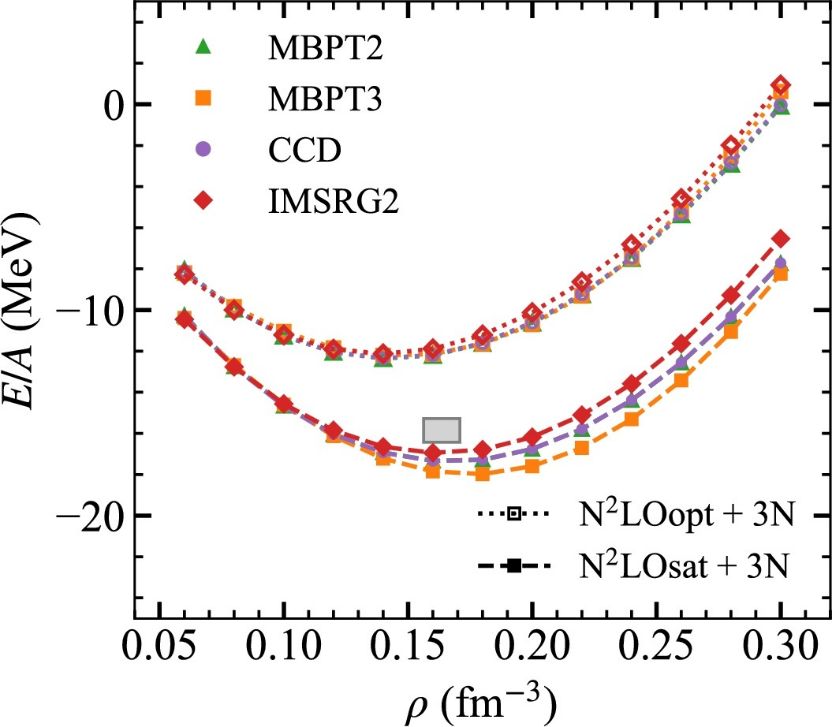 第一性原理计算从现实核力出发可以最大程度上减少模型相关性,也为理解核力与强相互作用提供了必要手段,是目前核物理的最前沿方向。随着引力波探测的出现,科学家通过中子星观测来约束致密核物质状态方程引起了广泛的兴趣。研究冷的致密核物质是描述从核物质到夸克物质相变过程的前提,但是很难通过核反应实验直接研究。所以基于精确的手征有效场论核力与先进的多体理论方法来可靠的计算致密核物质十分关键。