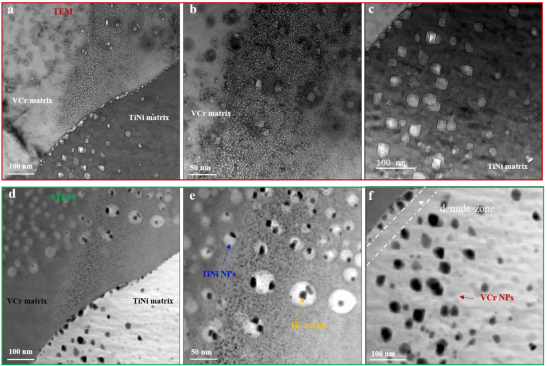 图2:辐照后的双相合金的氦泡微观形貌 (a) VCr 相和 TiNi 相的TEM图像;(b) VCr 相和 TiNi纳米析出相的TEM图像;(c) TiNi 相和 VCr NPs的TEM图像。(d-f) 分别为对应 (a-c) 的STEM HADDF图像