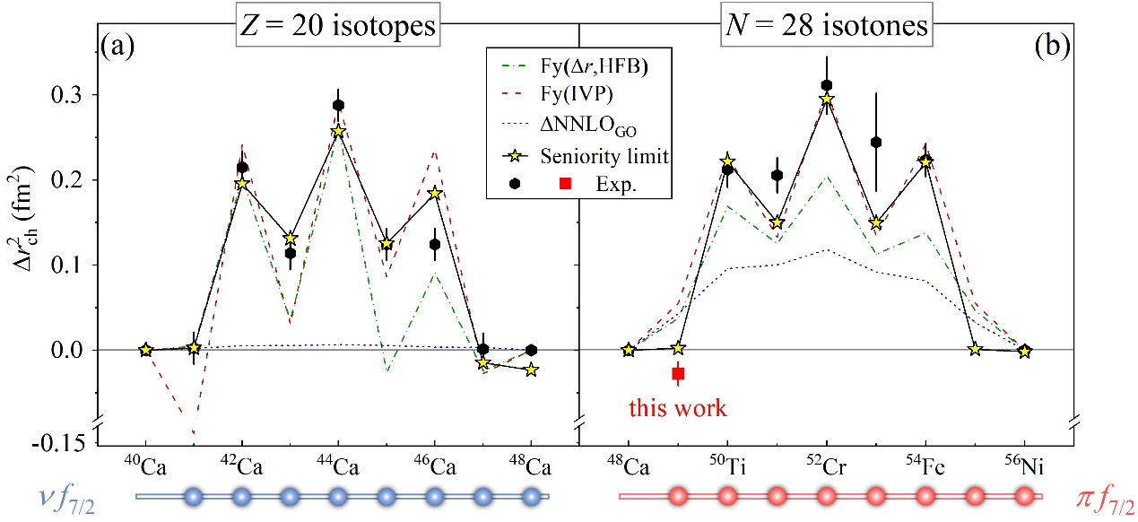 图1:左图,Z= 2040-48Ca同位素链(8个质子逐步填充壳模型0f7/2轨道)的电荷半径变化;右图,N= 28同中子素链(8个中子逐步填充壳模型0f7/2轨道)的电荷半径变化
